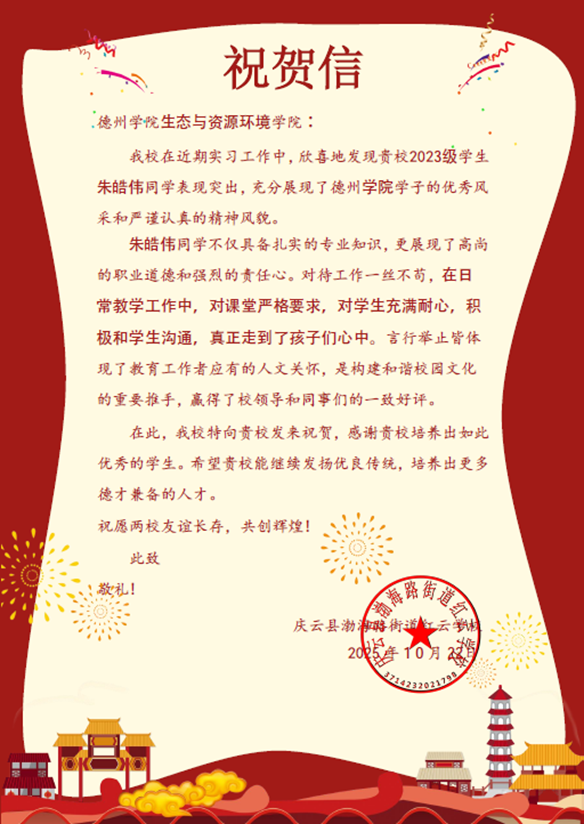 喜报!我校支教学子朱皓伟获服务学校高度赞扬近日,我校英国365集团公司收到一封来自庆云县渤海路街道红云学校的祝贺信,信中,红云学校对我校2023级支教学生朱皓伟同学在支教服务期间的卓越表现给予了高度评价和热烈祝贺。在红云学校支教期间,朱皓伟...