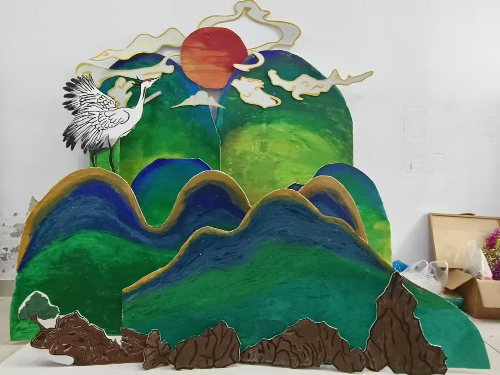 活动现场,同学们纷纷拿起画笔,尽情描绘心中的千里江山:有的同学勾勒出巍峨的山峰,有的绘出潺潺的溪流,还有的展现古色古香的亭台楼阁,每一笔、每一画都凝聚着他们对祖国山河的热爱和敬仰。同学们将一块块废弃的KT板巧妙组建,蓝色、青绿色等色彩跃然板上,绘制成了属于他们自己的“千里江山图”,在改造过程中,同学们不仅仅是在创造美,更是对废弃物进行了全新定义。