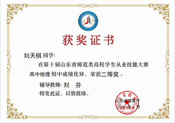 近五年,近五年来,在山东省师范类高校学生从业技能大赛中获二等奖2项、三等奖8项、钢笔字技能考核B级3项,在山东省大学生地理教学技能大赛中获特等奖2项、一等奖2项、二等奖8项、三等奖6项。“田家炳杯”全国师范院校师范生教学技能竞赛三等奖2项。多名实习生被授予“优秀实习支教生”“优秀支教大学生”“优秀支教教师”“优秀实习生”等荣誉称号。
