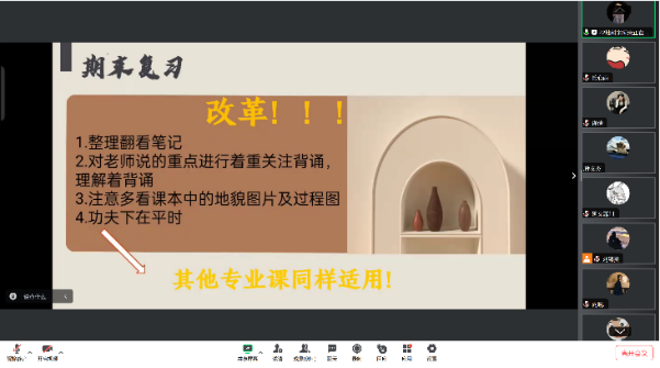 本次活动以线上会议的方式进行,邀请了我院2022级地理科学(师范类)专业的宋柯荣同学,针对地理科学专业相关学习心得进行分享。讲座过程中,宋柯荣同学在专业课学习、平时学习、考前复习等方面为同学们分享经验,进行答疑解惑,促进了彼此的交流与互动。优秀的学习方法如同一盏明灯,能够照亮同学们的学习之路,激发学术热情,培养创新思维,为学术研究和今后发展打下坚实的基础,正因同学们高涨的热情和积极的参与,活动进行的非常顺利,并取得了圆满的成功。