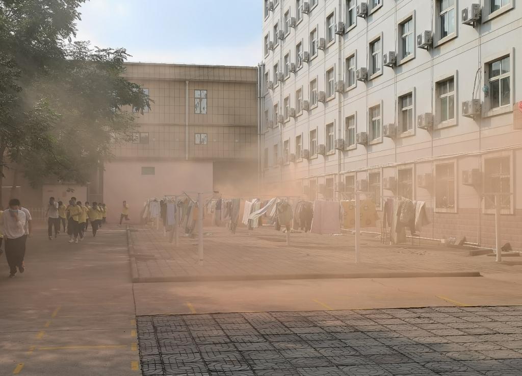 演练前我院领导和公寓教师,结合实际情况认真细致的制订了演练活动方案,明确职责要求。在演练过程中随着警报的响起,各位老师及时准确的到达指定位置,认真协助新生疏散,确保活动安全顺利的举行。正在宿舍楼的学生,立即从指定位置上起立,快速有序的奔向走廊,在学长们的带领下,根据预定路线,弯着腰,猫着步,捂住口鼻,有序撤离到学校宿舍楼下安全地带的指定位置,并站好。整个过程紧张有序,实用性强,达到了预期的效果。