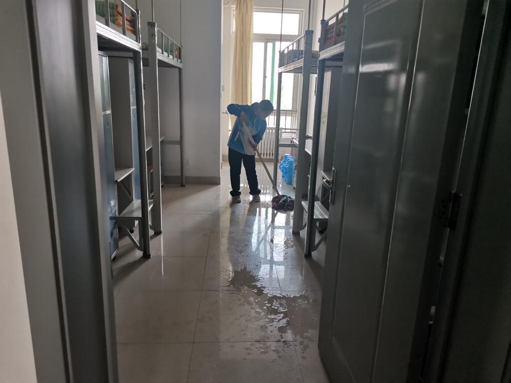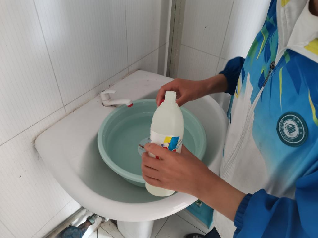 学生自律委员会带领大一新生前往新生宿舍,领取消毒液,对大一宿舍进行全方位、多角度消毒。
