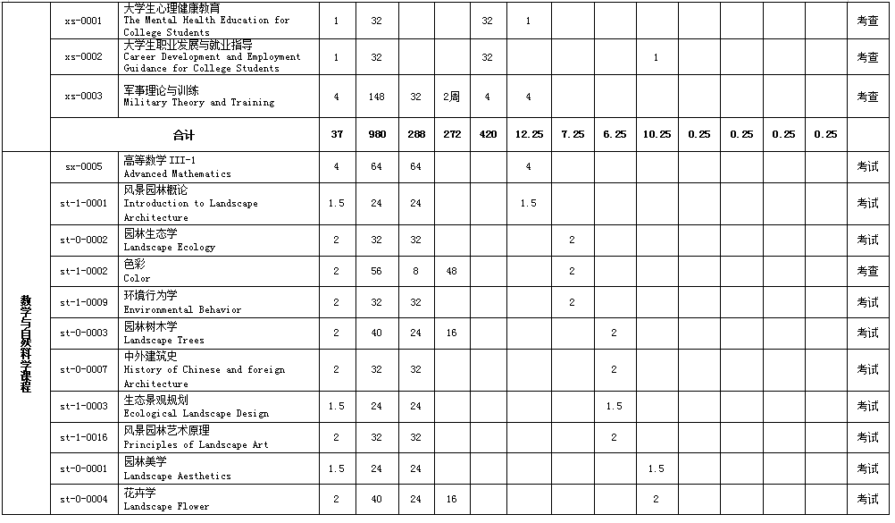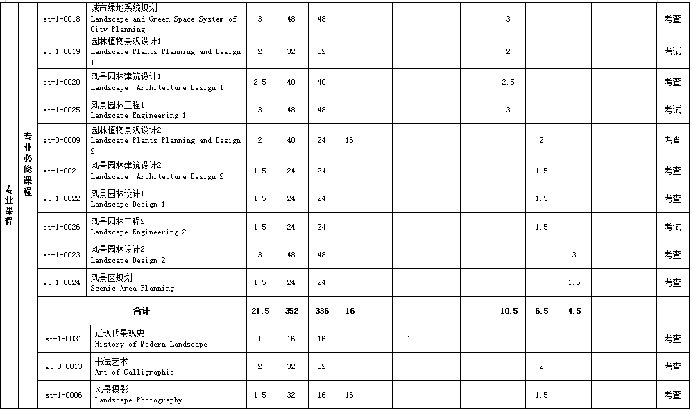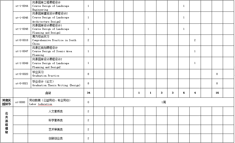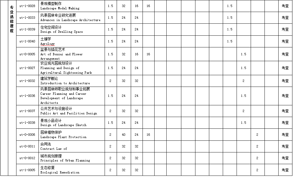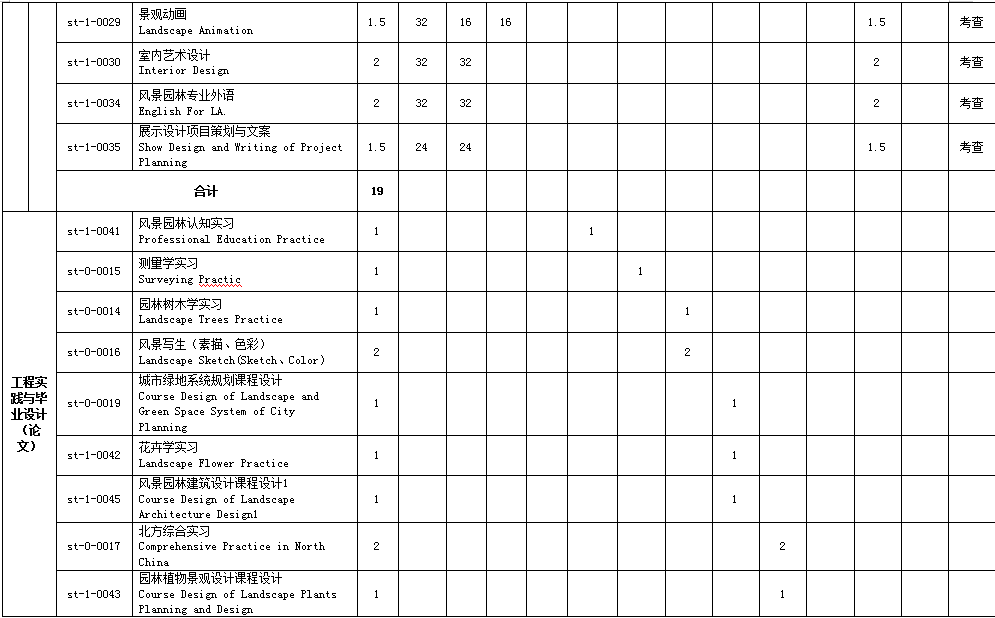 风景园林认知实习,园林树木学实习,花卉学实习,测量学实习,风景写生(素描、色彩),园林植物景观设计课程设计,风景园林工程课程设计,风景园林建筑设计课程设计,风景园林设计课程设计,北方综合实习,南方综合实习,风景区规划课程设计,城市绿地系统规划课程设计,毕业实习,毕业设计(论文)。