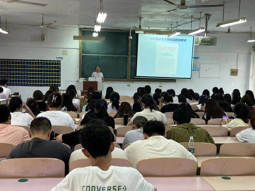 实验中心主任唐艳讲解了实习支教需要完成的任务,尤其是需要在校友邦平台完成签到、月志、实习报告和支教生鉴定表等。指导教师代表王璐指出了支教实习的目的,强调同学们要结合山东省师范类高校学生从业技能大赛的要求,在支教实习过程中强化“三字一话一图” 教学基本功和教学技能训练和班主任管理能力的提升。