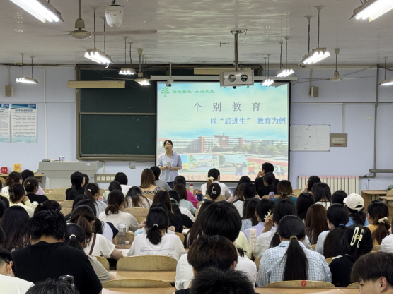 李玉霞副校长以个别教育——“后进生”教育为主题,结合自身丰富的工作经历与经验,从日常班级管理实例切入,以幽默风趣的语言向同学们分享了多年班主任工作的深刻体会。她围绕“后进生”教育,介绍了她的职业生涯中角色的转换,传授了她在职业中的经验与班级管理的技巧,为同学们展示了“创新”在班级管理中的积极作用,提供了新颖且实用的班级管理思路与方法。