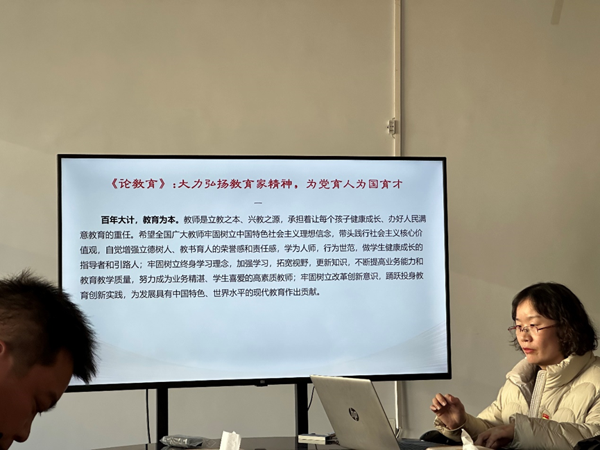 为深入贯彻落实党的教育方针,提升教师职业道德水平,增强教师教书育人的责任感与使命感,特开展此次专题培训。在宋宁宁老师的带领下,全体党员集体学习了学校下发的意识形态工作与师德师风专题学习培训材料,观看了人民教育家于漪、高铭暄的事迹视频,学习了警示教育典型案例。