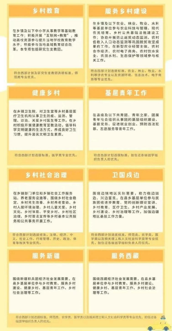 乡村教育专项:如果你是师范类专业,或者你有赴西部支教的梦想,你可以在乡镇及以下中小学从事教学等基础教育工作。本专项包括研究生支教团。