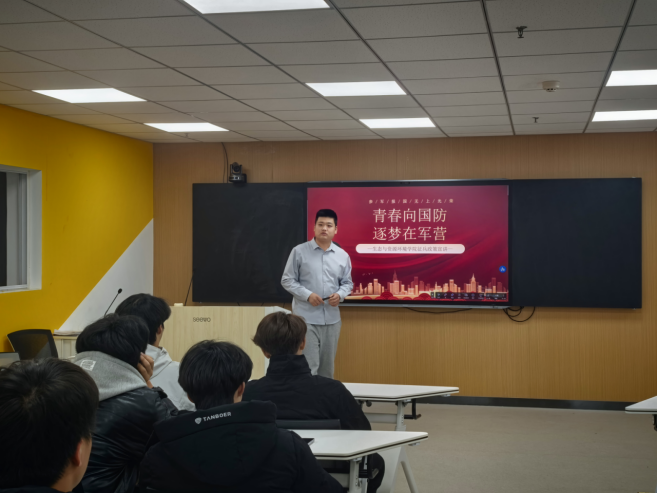 宣讲环节,杨振飞老师主要围绕2026年征兵政策展开解读,阐述征兵对象的年龄要求、体检标准、政治考核等基本流程,重点剖析大学生入伍在学业、就业等方面的优惠政策,帮助同学们科学规划军旅与学业的衔接。