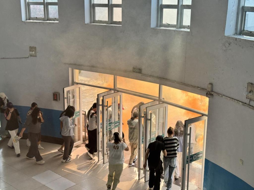 随着警报声响起,同学们迅速反应,在老师和公寓管理员的指引下,用湿毛巾捂住口鼻,弯腰沿墙有序撤离。大家严格按照预定路线疏散,快速抵达公寓广场集合点,整个过程紧张有序,展现了良好的应急能力。与此同时,学院应急小组迅速行动,模拟灭火、维持秩序,为演练增添实战效果。演练结束后,保卫处工作人员为同学们讲授了一堂生动的“安全课”,大家认真聆听消防知识讲解,并积极参与灭火器使用实操练习,掌握了正确的消防技能。