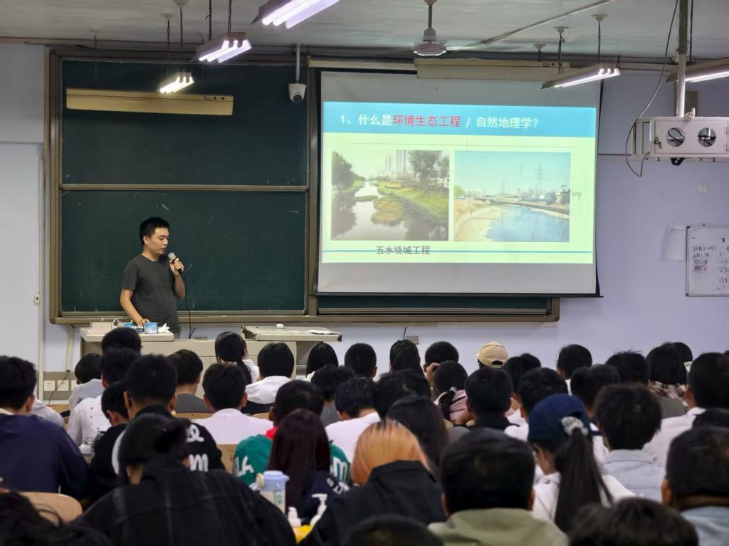 宋宁宁老师以“五水绕城工程”等实际项目为例,深入解读环境生态工程专业,作为生态学、环境科学、工程学交叉融合的新兴专业,以解决开发建设过程中山水林田湖草的环境治理和生态修复难题为使命,以受损生态系统修复、水土保持等生态工程问题为特色,培养具备生态环境监测与评价、生态修复工程设计与运行、环境生态规划与管理等方面工作的应用型工程技术人才。同时作为自然地理与资源环境专业负责人,她围绕自然地理要素监测、资源动态评估及生态系统保护等专业核心领域,结合流域地理调查、耕地资源优化配置等实际案例,详细解读专业在“摸清地理家底、保障资源安全、服务生态建设” 中的定位与作用,帮助新生厘清 “自然地理规律研究 - 资源可持续利用 - 生态保护实践” 的专业逻辑,明晰理论学习与野外调查、数据分析等实践技能的结合方向,为新生快速建立专业认知、规划学习路径提供有力指导。