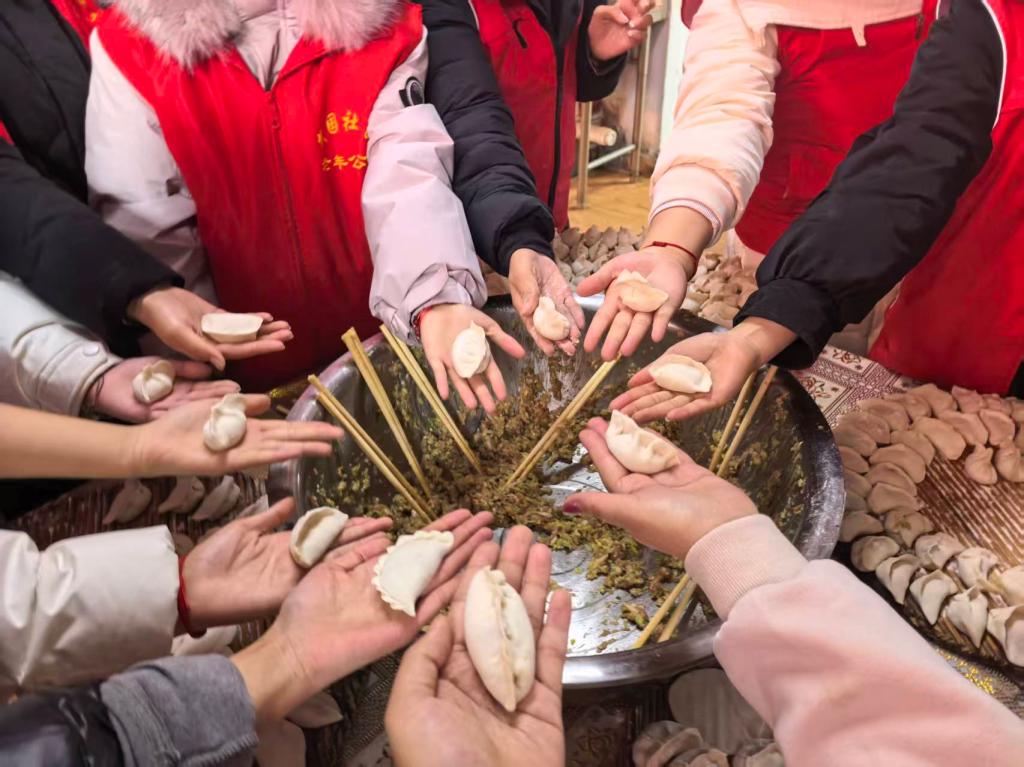 活动现场暖意融融,志愿者们与社区工作人员分工协作、默契配合,有条不紊地投入到包饺子的环节中。和面、擀皮、填馅、捏合,大家动作娴熟、各司其职,一个个白胖饱满的饺子很快便摆满了桌案。随着饺子下锅,氤氲的水汽袅袅升起,活动室里的氛围也愈发热闹温馨。饺子出锅后,志愿者们将热气腾腾的饺子小心翼翼地端到老人面前,随后围坐一旁与老人们亲切交谈。聊天间隙,志愿者们还主动为老人揉肩捶背,耐心倾听他们讲述过往的故事。欢声笑语回荡在活动室中,浓郁的饺香与温情的陪伴交织,驱散了冬至的寒意,勾勒出一幅敬老爱老的暖心画卷。