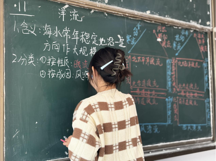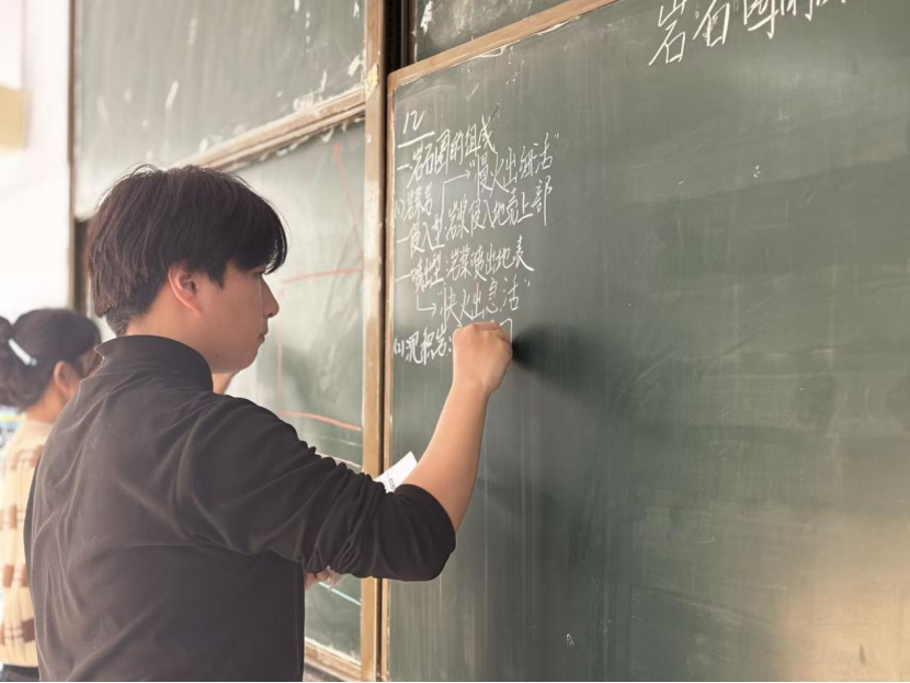 比赛现场气氛热烈,参赛同学们凝神执笔,巧妙构思。板书区域,一笔一画工整有力,层次分明,展现出清晰的教学逻辑与扎实的书写功底;板画创作区,色彩与线条交织,山河地貌、生态万象跃然板上,体现出同学们对专业知识的理解与艺术表达的融合。评委们从内容准确性、设计创意、技术规范与视觉表现等维度进行综合评价,每一份作品都凝聚着同学们对教学的热爱与对专业的思考。