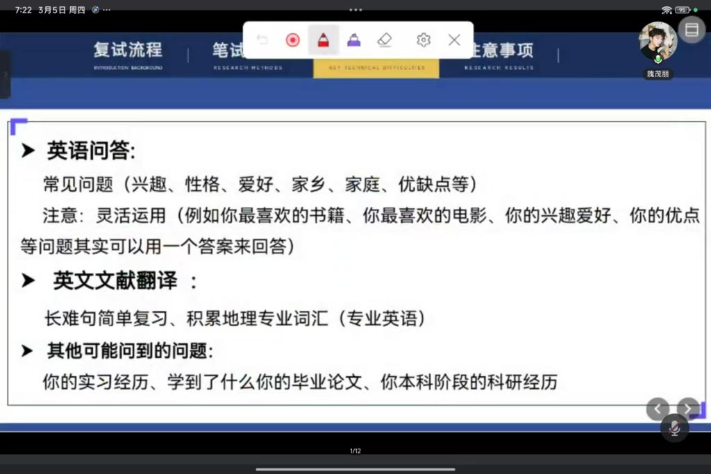 分享会上,李彦香学姐围绕调剂全流程进行系统讲解,梳理了调剂备考框架,指出常见调剂误区,并分享了信息搜集、志愿填报、院校选择等实用策略。隗茂丽学长与王佳雨学姐则结合地理学专业特点,拆解复试笔试与面试的备考要点,从答题逻辑、英语准备、专业问答等方面给出针对性指导,内容详实且极具实操性。