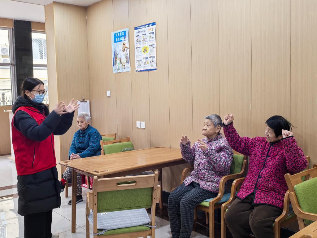 活动现场,志愿者首先为老人们带来手指养生操教学。整套动作简单舒缓、节奏适中,贴合老年人身体特点,老人们积极抬手跟练,现场氛围轻松融洽。在随后的肩颈放松环节,志愿者带领老人们进行轻柔安全的拉伸训练,对动作不到位的老人耐心示范、逐一指导,帮助大家活动筋骨、舒缓疲劳,以实际行动守护老年朋友的身体健康。