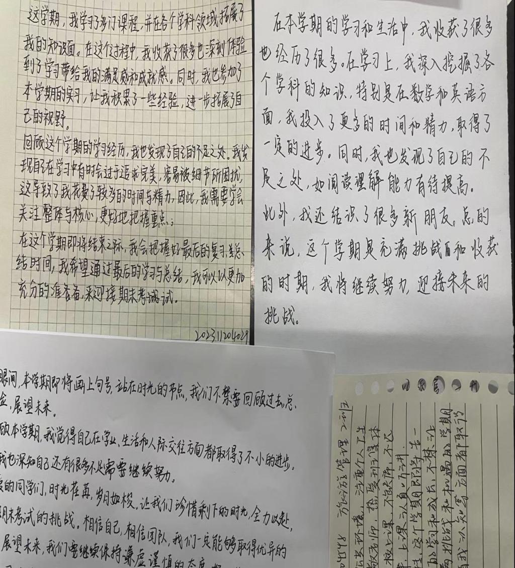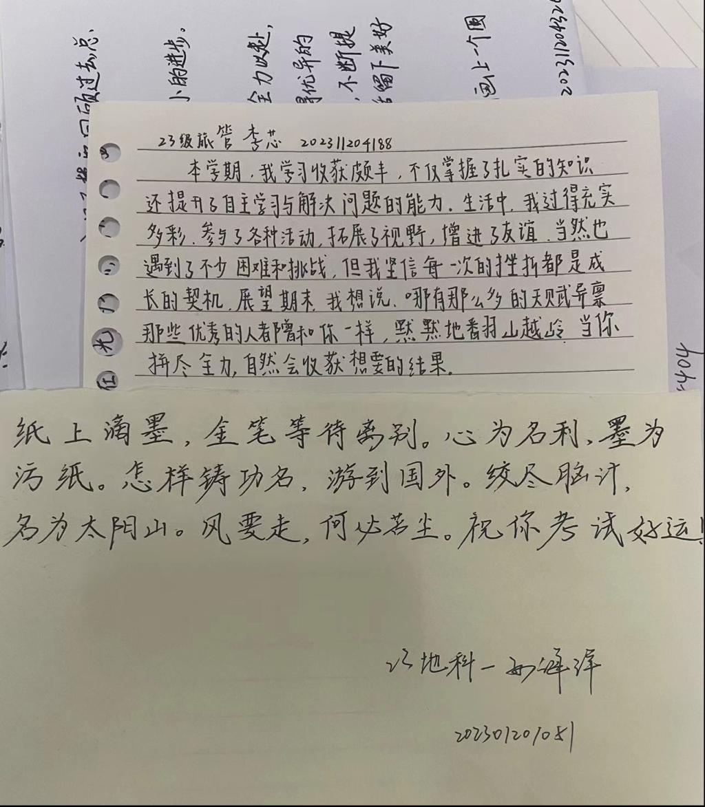 活动现场,同学们积极参与,纷纷在精心准备的卡片上写下对自己、对同窗好友以及对整个班级的期末寄语。有的同学写下了对自己本学期努力付出的肯定,鼓励自己在期末考试中保持冷静,发挥出最佳水平;有的同学向舍友表达了深深的感激之情,感谢他们在学习和生活中的陪伴与支持,并祝愿大家都能取得优异成绩;还有班级以集体的形式写下了共同的目标和期望,展现出团结一心、共同奋进的精神风貌。通过这次活动,同学们学会了如何用心去感受生活,用艺术去表达内心,这对于他们未来的成长和发展具有深远的影响。