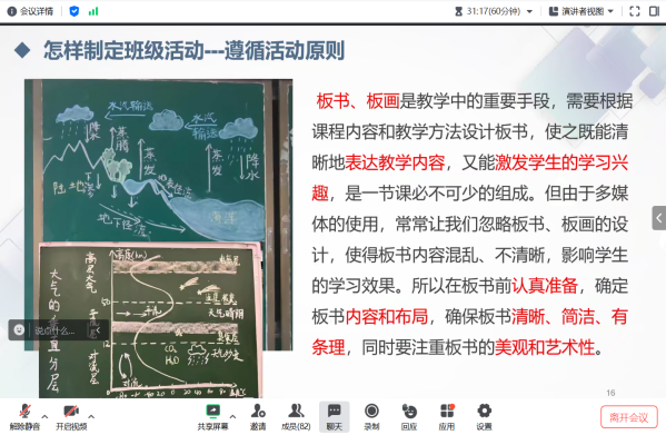 本次活动以线上讲座的形式展开,邀请了我院2021级地理科学(师范类)专业的隗茂丽同学分享她的学习心得和学习经验,并为大家答疑解惑。隗茂丽同学从专业课学习、师范生技能、大学生竞赛三个方面分享了自己的心得体会,以及在专业课学习和实践学习中的方法与经验。同学们听得认真,积极提问,活动取得了圆满成功。