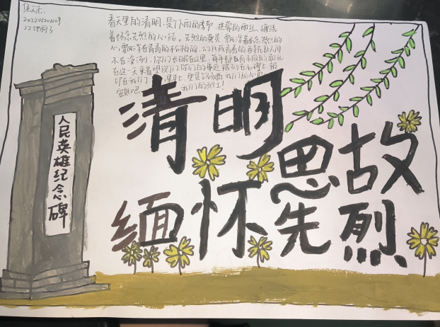 此次活动形式多样,同学们可以通过手抄报或绘画制作,征文写作,书信传情,诗歌创作,视频制作等形式参加活动。多样的活动形式同时也提高了同学们参加此次活动的热情。同学们绘制清明主题手抄报,撰写文章,充分表达了大家对先辈的思念和崇敬,也充分体现出同学们对英雄先烈的敬仰之情。