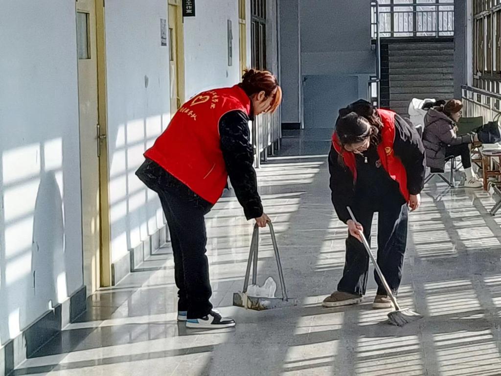 活动中,志愿者们手拿扫帚、垃圾袋,以教学楼为中心,将周围环境的垃圾进行了全面清扫,随后打扫了教学楼的教室和老师办公室,擦拭桌椅黑板,为师生提供了干净明朗的学习工作环境。志愿者们以奉献服务为初心,分工明确,相互配合,积极投入活动。
