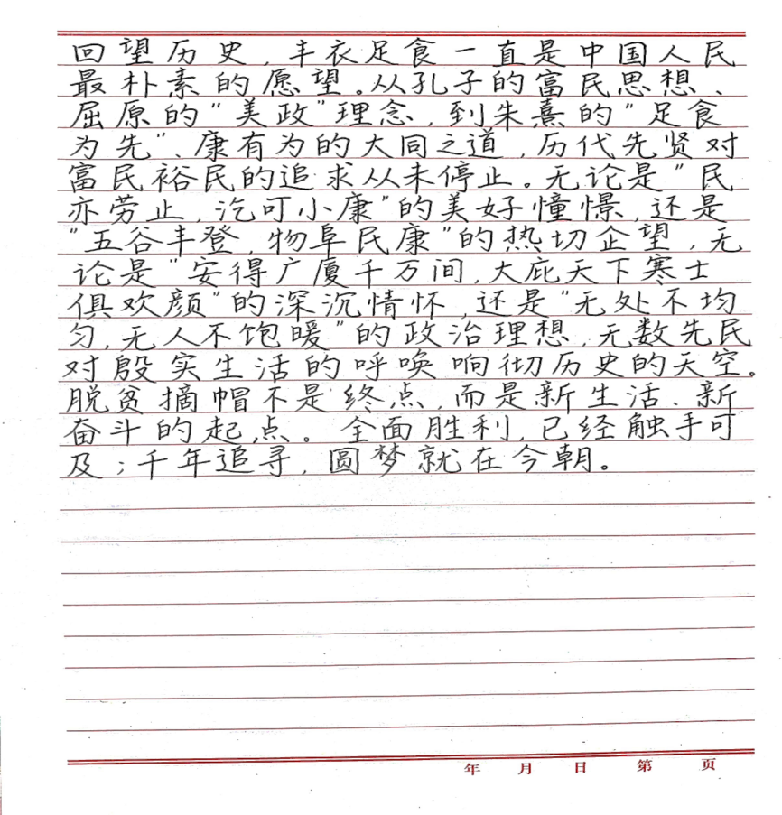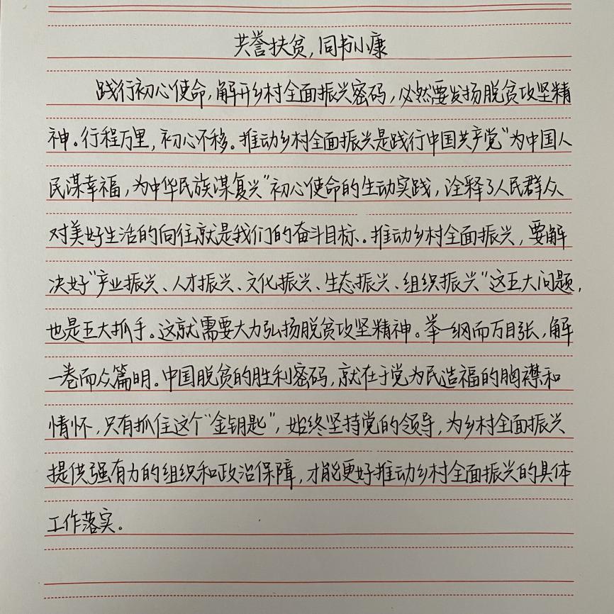 本次活动由学生会社团部主办,20级与21级全体同学参与了本次活动。活动主要围绕2020年打赢脱贫攻坚战的主题展开,以书写硬笔书法的形式共同见证脱贫攻坚的伟大事业。活动过程中,同学们积极参加,将自己对书法的热爱与祖国光荣事迹完美融合。