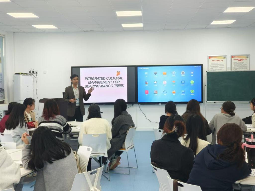 下午,费利佩博士给风景园林专业的学生上了一节生动的面授课。费利佩博士以其丰富的专业知识和新颖的教学形式,为学生们深入讲解了芒果树的生长环境、种植模式以及提高芒果产量的有效方法,通过实际案例和互动讨论,大大激发了学生们的学习兴趣和参与热情。